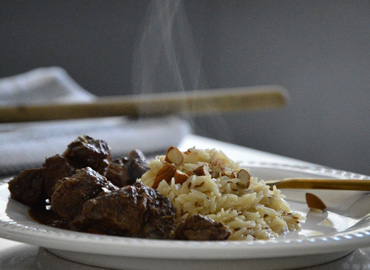 Salteado de carne, berenjenas y hongos con mijo