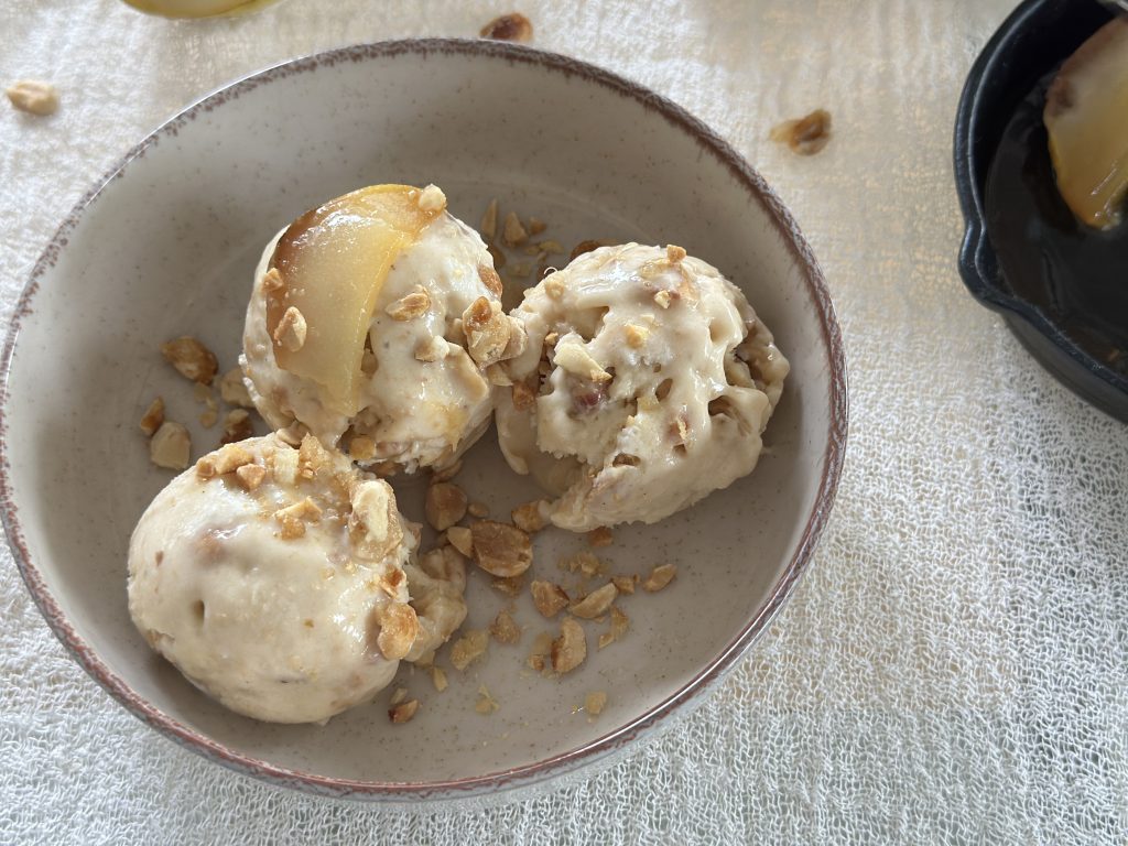 Helado de peras con maní crujiente