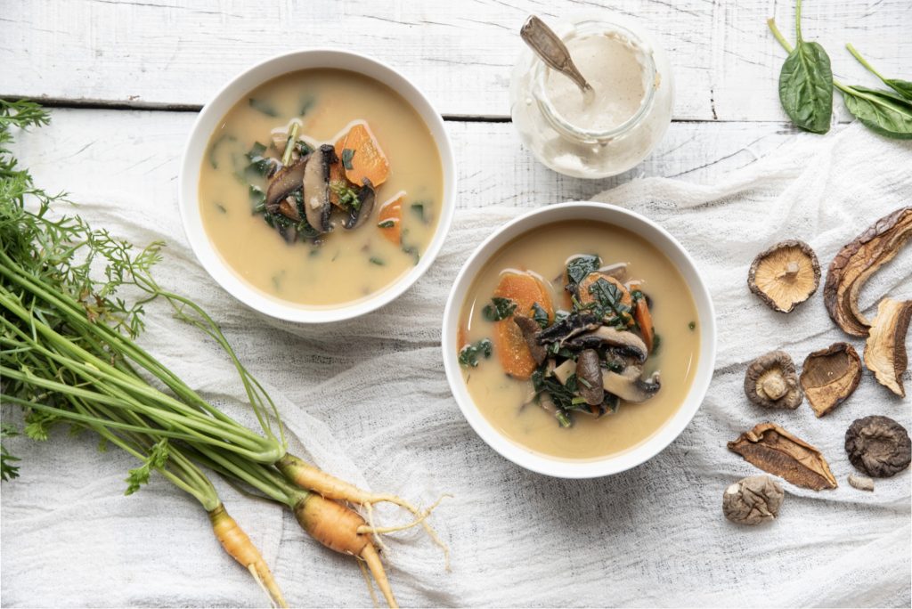 Sopa de hongos y espinaca con crema de cajú
